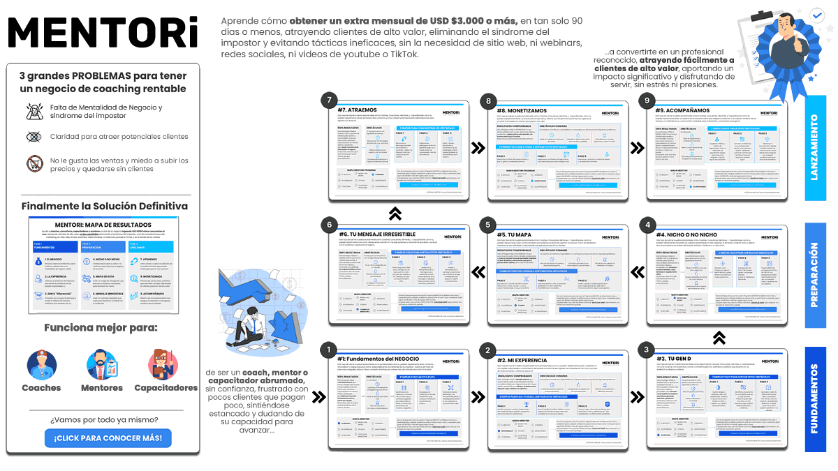 Entonces, si está frustrado con el estado actual de su negocio de Mentoring y/o Coaching, tenemos el camino claro a seguir y un soporte incomparable para ayudarte a alcanzar sus objetivos.