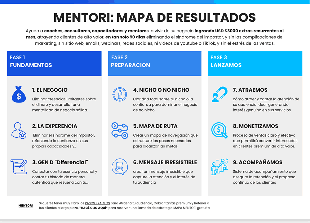 Esta estrategia refleja el SISTEMA EXACTO que uso para ayudar a innumerables Mentores, coaches, consultores, formadores y expertos de manera rápida y predecible para que obtengan su Sistema único de resultados, para que lo ofrezcan y vendan de manera fácil y rápida.